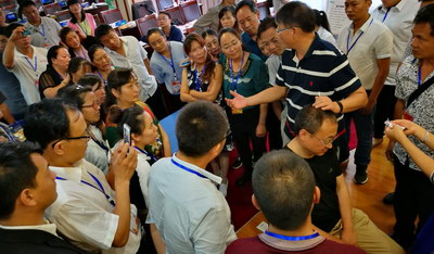 魏教授演示背部點(diǎn)揉法,基層醫生學(xué)員們將魏教授團團圍住,邊聽(tīng)邊看邊記錄,學(xué)習熱情高漲。演示模特均由學(xué)員自愿擔任,圖中女醫生當時(shí)正好左上腹疼痛,經(jīng)魏教授點(diǎn)揉、拔/走罐等治療后,疼痛立解。立竿見(jiàn)影的治療效果大大提升了醫生們的信心。